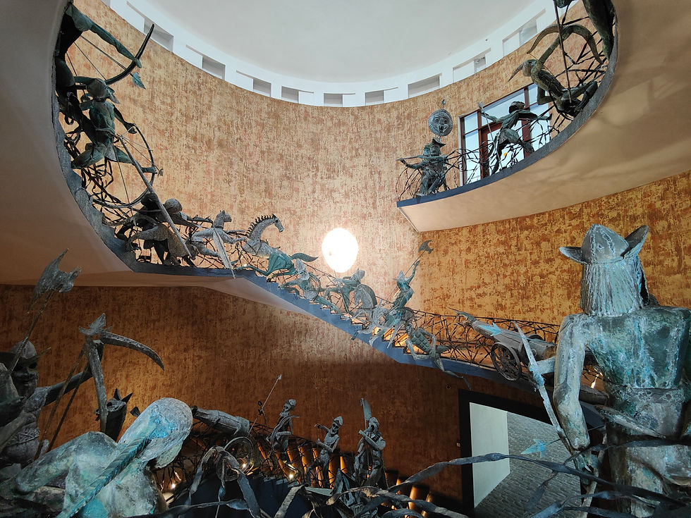 芸術家のラキはバワの親友でヘリタンスカンダラマのフクロウの彫刻などが有名だが、この作品は17世紀のポルトガル軍とシンハラ軍の戦いをテーマにししており、銅と真鍮の繊細な彫刻が渦を巻くように配置されている。